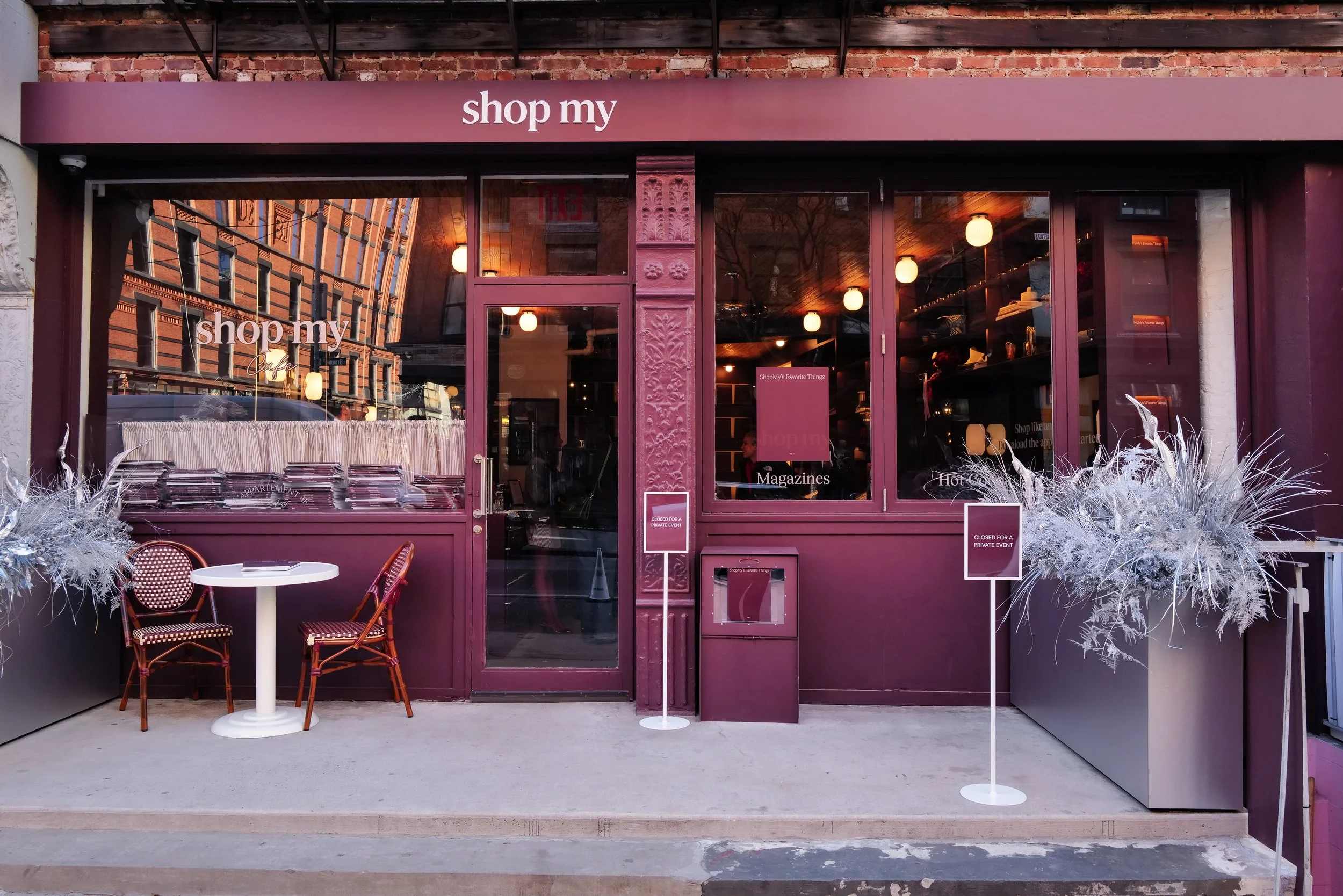 A blank storefront reimagined as the ShopMy Café for the holidays debuting with a VIP Favorite Things launch event, followed by a cozy weekend pop-up featuring a custom 100-page magazine, hot cocoa by L’Appartement 4F, and exclusive giveaways.